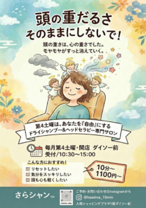 「頭の重さは、心の重さでした。モヤモヤがすっと消えていく。」第4土曜日はあなたを自由にするドライシャンプー&ヘッドセラピー専門サロン開催。毎月第4土曜日・サイオス1階・受付10:30~15:00・10分~/1100円~